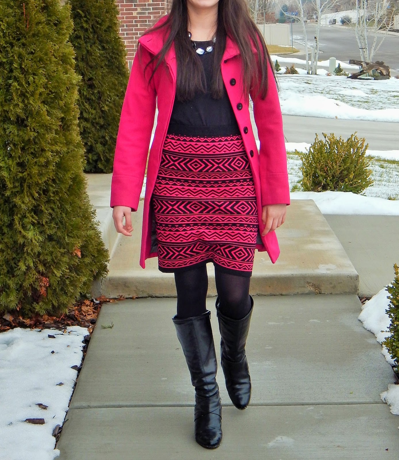 I love this combination of the coat from Old Navy with the aztec pattern skirt from Forever 21. It creates a youthful yet refined look. The necklace from Dressing Your Truth is one of my staple pieces. It can go with just about ANYTHING. A "must-have" is the cap sleave black shirt from Mod Bod. It' a great piece to layer and create a modest outfits. Gotta love Sundays!