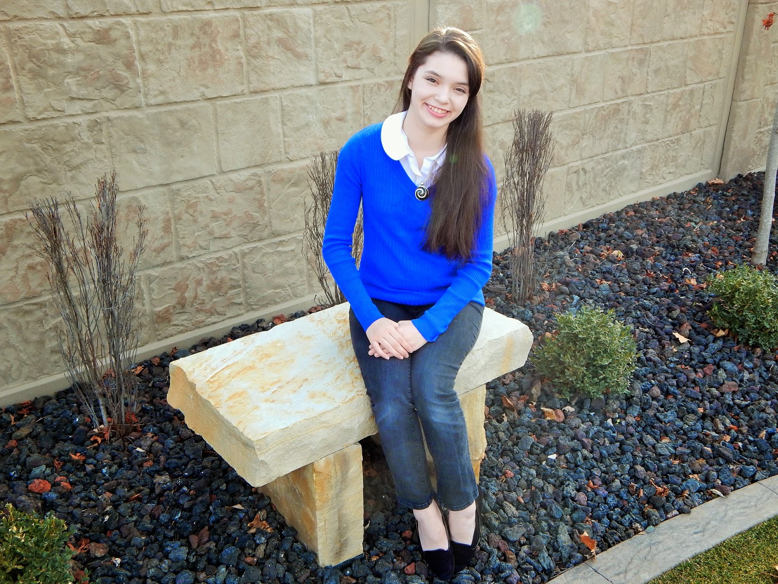 Speaking of school... this preppy look is one of my favorites. A simple blue sweater over a white peter pan collar shirt (a popular trend right now). I paired it with simple black jeans, suede black flats, and a statement necklace. I love the swirl of the silver rhinestones and black and uniqueness of the necklace. Such a great staple piece! You can get the sweater and collared shirt just about anywhere. The necklace is from Dressing Your Truth store.